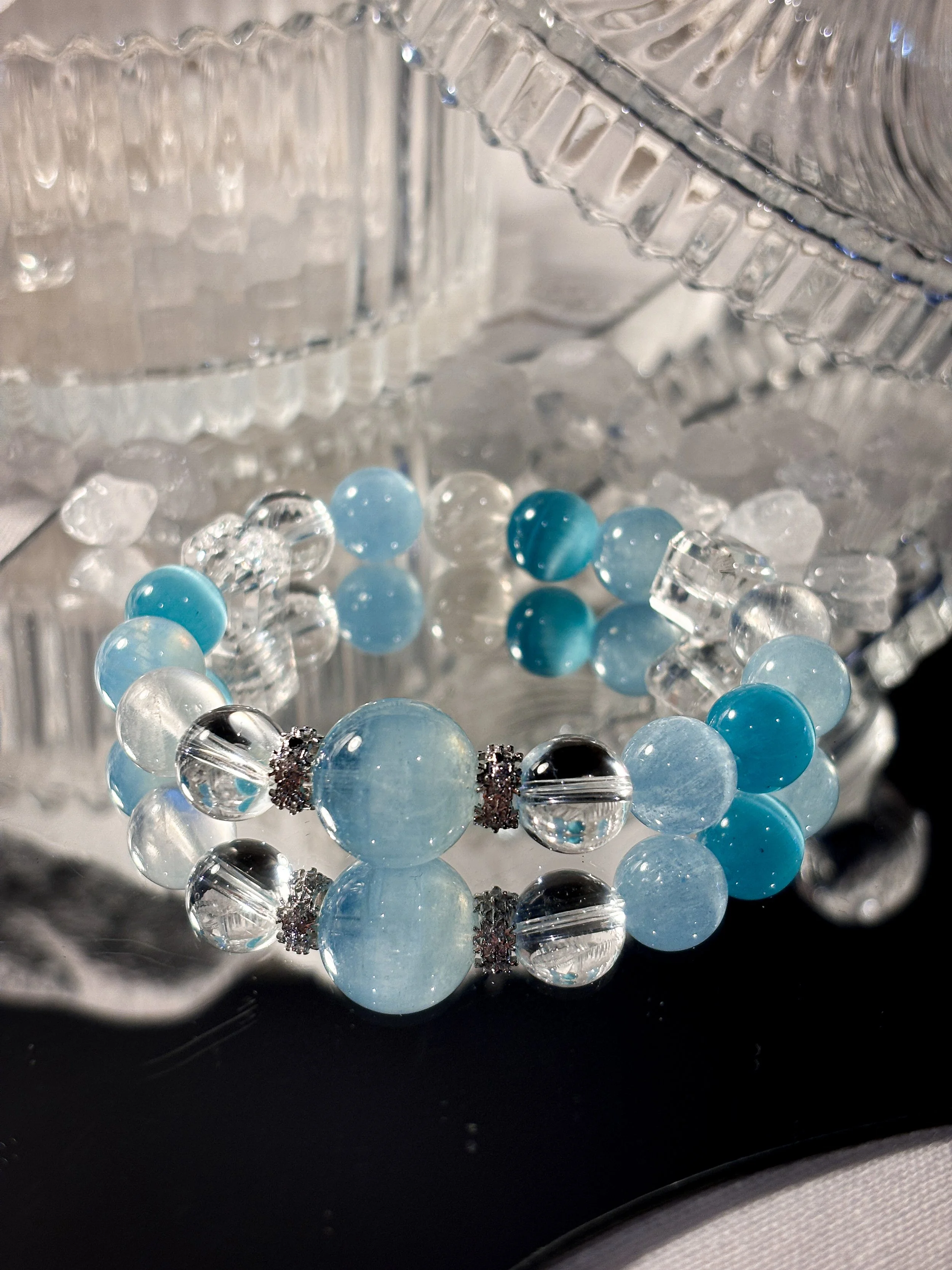 This bracelet combines the fresh blue of Aquamarine, the pure transparency of Clear Quartz, and the unique inclusions of Snowflake Phantom Crystal to create a tranquil and mysterious atmosphere. Aquamarine is known for its ability to enhance communication and clear thinking, Clear Quartz is valued for its versatility and energy amplification, and Snowflake Phantom Crystal is loved for its characteristics of promoting inner insight and communication skills.